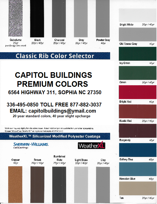 WE OFFER 12 STANDARD COLORS WITH A 20 YEAR WARRNTY AND 20 PREMIUM COLORS WITH A 40 YEAR WARRANTY FOR A SMALL UPCHARGE.
